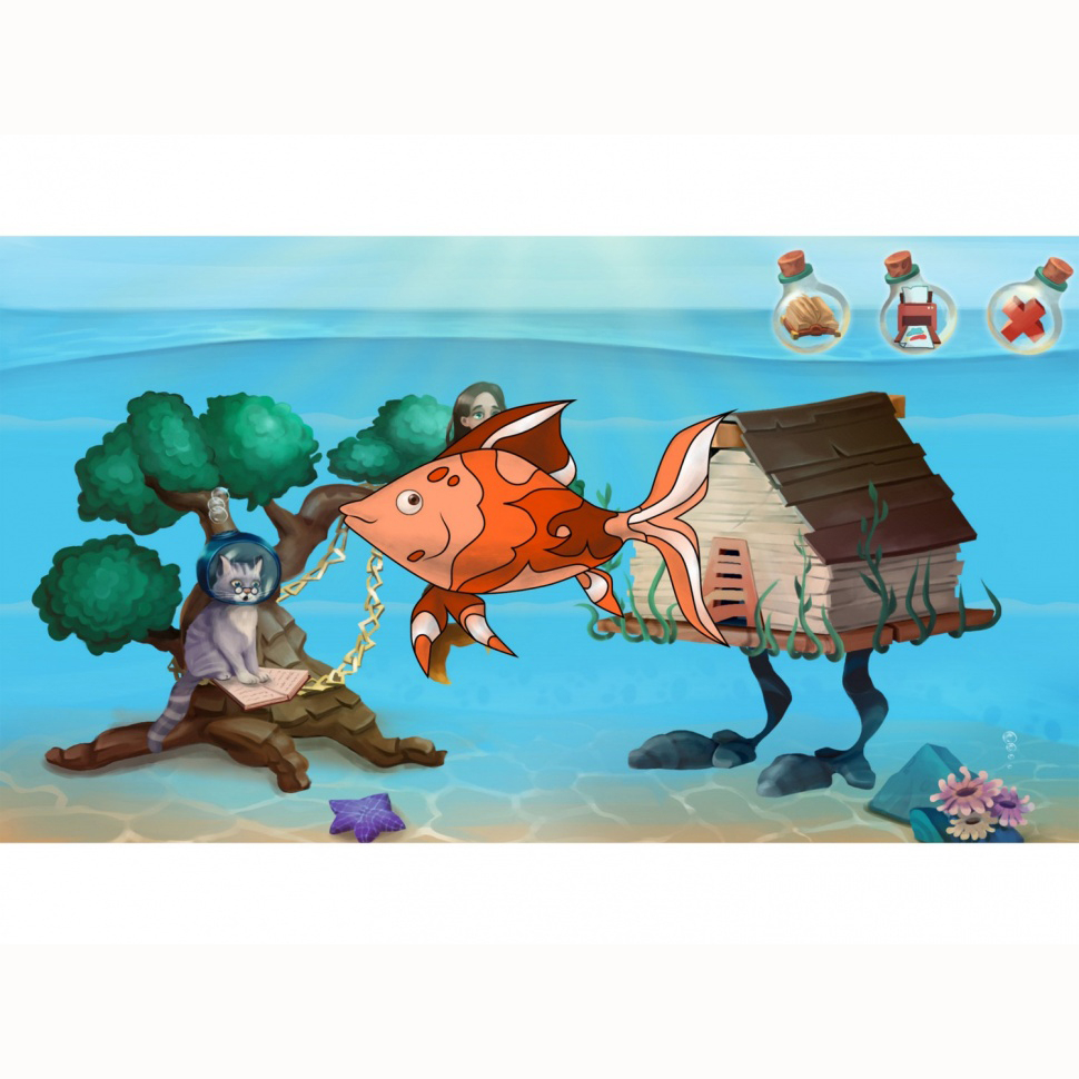 1) Интерактивное морское дно, которое населяют анимационные герои сказок А. С. Пушкина: русалка, избушка на курьих ножках, ученый кот, богатыри. Эти персонажи двигаются, а среди них плавают рыбки, раскрашенные детьми.