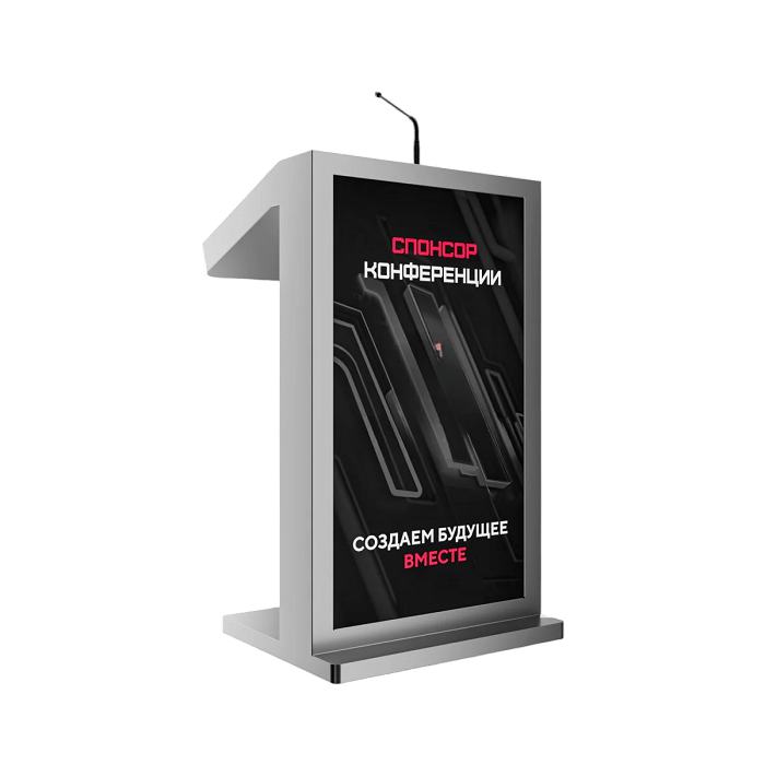 Мультимедийное решение, которое позволяет не только ярко выступить на большую аудиторию, с отображением презентационного материала, но и эффектно продемонстрировать рекламную информацию о компании, предлагаемых товарах / услугах, спикере, на большом внешнем дисплее трибуны. Модель Double 23,8" оснащена мощным микрофоном, сенсорным дисплеем для спикера, а также большим внешним дисплеем для рекламного контента и набором разъемов для подключения дополнительной техники. Такая трибуна станет прекрасным помощником на конференциях, выставках, спортивных мероприятиях или других мероприятиях, где требуется визуальная поддержка презентаций и общение с аудиторией.