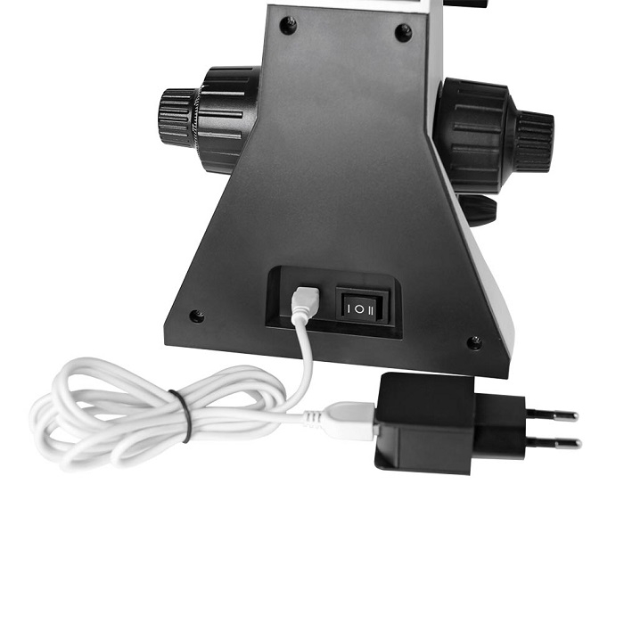 Питание осветителей производится от 3-х батареек формата АА или от сети переменного тока 220 - 240 В через входящий в комплект сетевой адаптер. Также микроскоп может получать питание от порта USB компьютера. Возможность питания микроскопа от батарей или внешних устройств позволяет пользоваться микроскопом не только в учебном классе или дома, но и в любых ситуациях, когда электросеть недоступна.