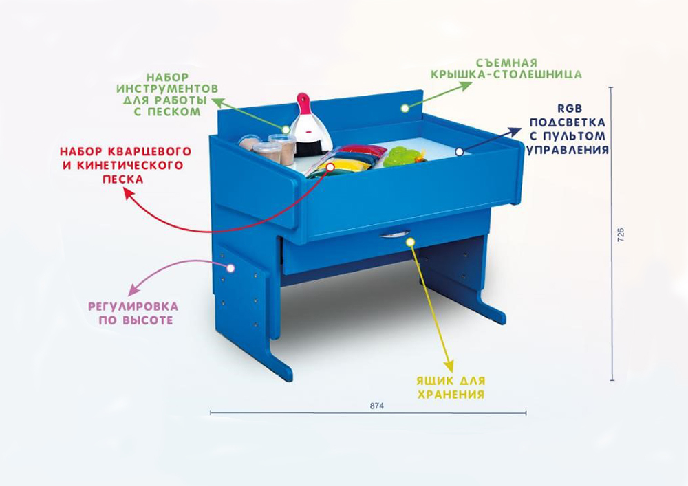Многофункциональный тактильный комплекс-парта, представляет собой комбинированное рабочее место дошкольника или ребенка младшего школьного возраста. Отличительной особенностью данного комплекса является его полифункциональность: сняв столешницу можно работать с двумя видами песка (кинетическим и кварцевым), вернув столешницу на место, комплекс становится полноценным рабочим местом – партой. Работа с песком ведется на антивандальной закаленной порезобезопасной поверхности, оснащенной по периметру светодиодной подсветкой RGB (в комплекте идет пульт управления), а для песка имеются специальные углубления-отсеки. Для хранения дидактики и других пособий в комплексе предусмотрены специальные выкатные ящики.