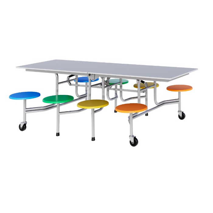 • Кромка столешницы антивандальная из полиуретана, цвет синий, покрыта HPL пластиком, сиденья круглые - 8 шт, ЛДСП 16мм, цветное, кромка ПВХ 2мм.