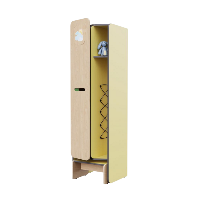 Детский шкаф-кабинка для хранения вещей и игрушек. Он разделён на две функциональные зоны: открытую - для верхней одежды, чтобы просушить её после прогулки в сырую погоду, и закрытую - для сменной одежды и обуви. Снизу шкафа идёт выдвижная скамейка. Предмет из коллекции мебели «НЕГА».