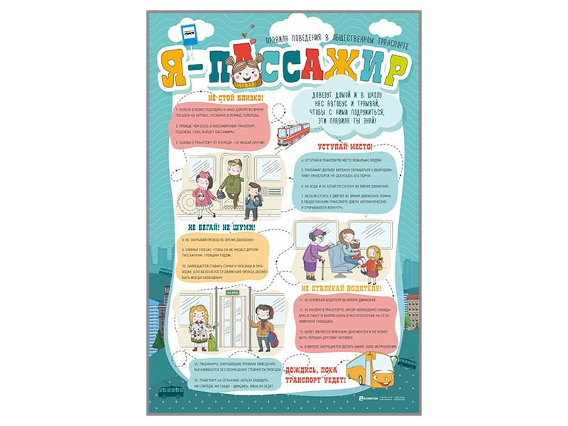 Стенд представляет собой информационную панель, на которой размещены правила поведения в транспорте общего пользования для юных участников дорожного движения.