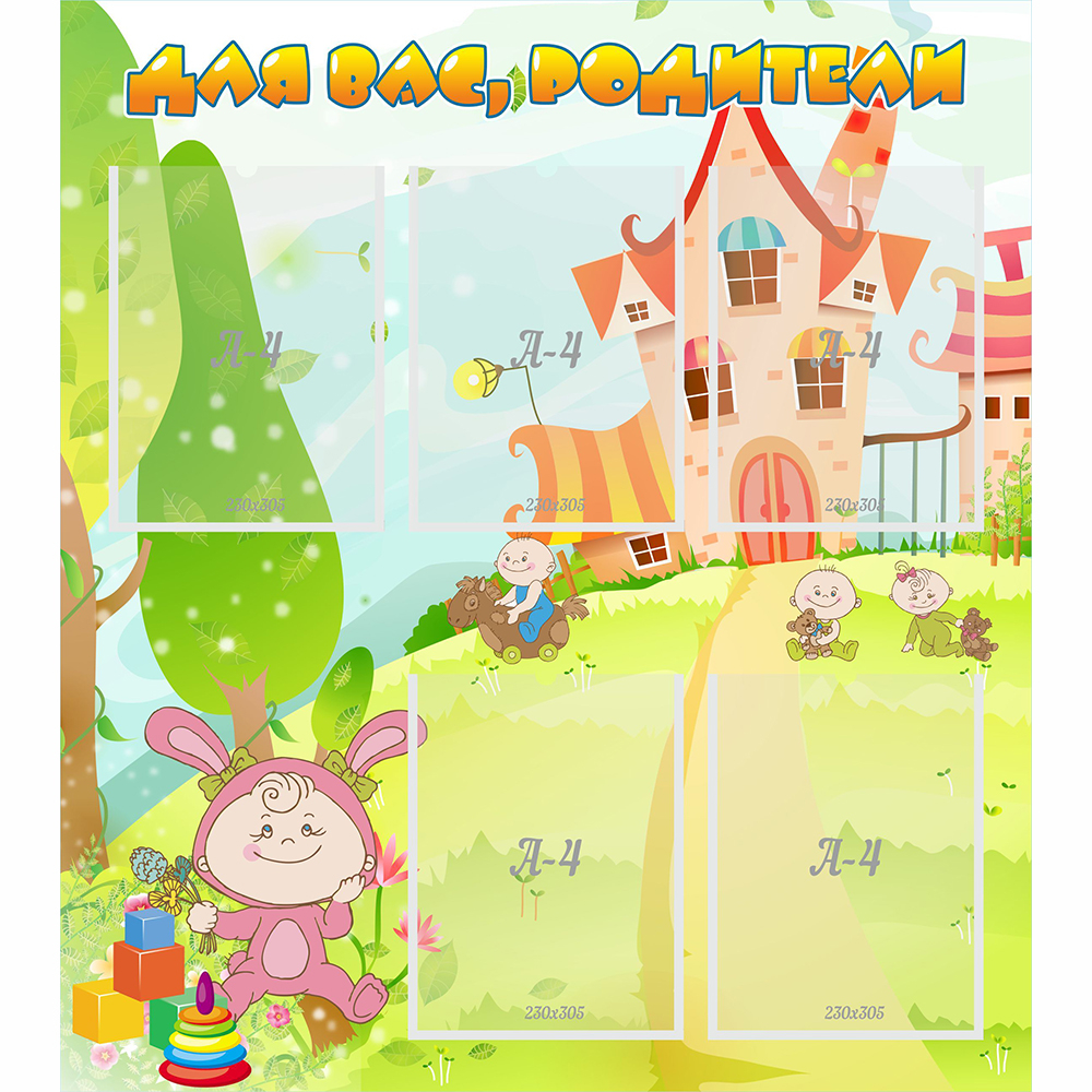 Большой и красочный стенд с заметной надписью служит для своевременного информирования родителей о текущих делах и приближающихся мероприятиях детского сада. В вертикальных карманах можно разместить объявления, списки, фотоснимки.